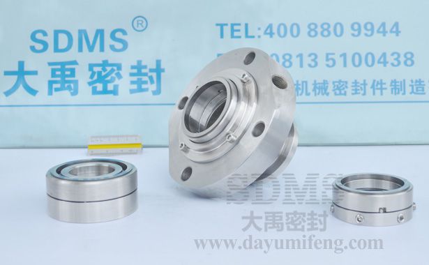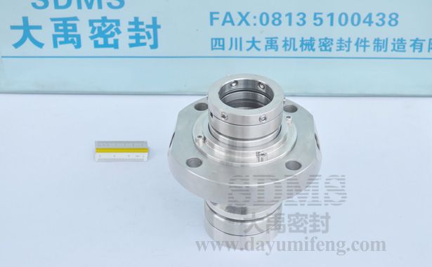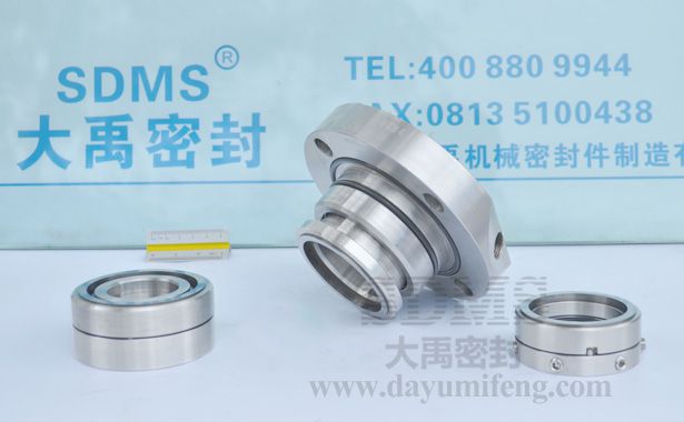 ????? 該產品為雙端面機械密封,分別由兩動環兩靜環組成也可由兩動環共用一靜環或兩靜環共用一動環組成。雙端面機封一般用于高危險介質,泄漏到空氣中,會對工作人員或設備有嚴重的危害的情況。內部采用大單彈簧結構的設計,適用于軸承稍微大一點,轉速不快的情況,并且介質中的小臟物、介質結晶等物質對彈簧機械性能影響小。?